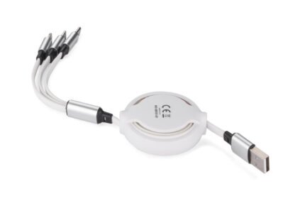 Retractable BALJO USB cable is the perfect combination of style and practicality. Thanks to its unusual form, you do not have to worry about getting tangled. Equipped with three tips for charging various devices: USB Type-C, Lightning (iPhone) and micro USB. The case is made of solid material, the cable is coated with a soft, pleasant to the touch rubber, which ensures long-term durability and ease of use.Expands to 113cm.